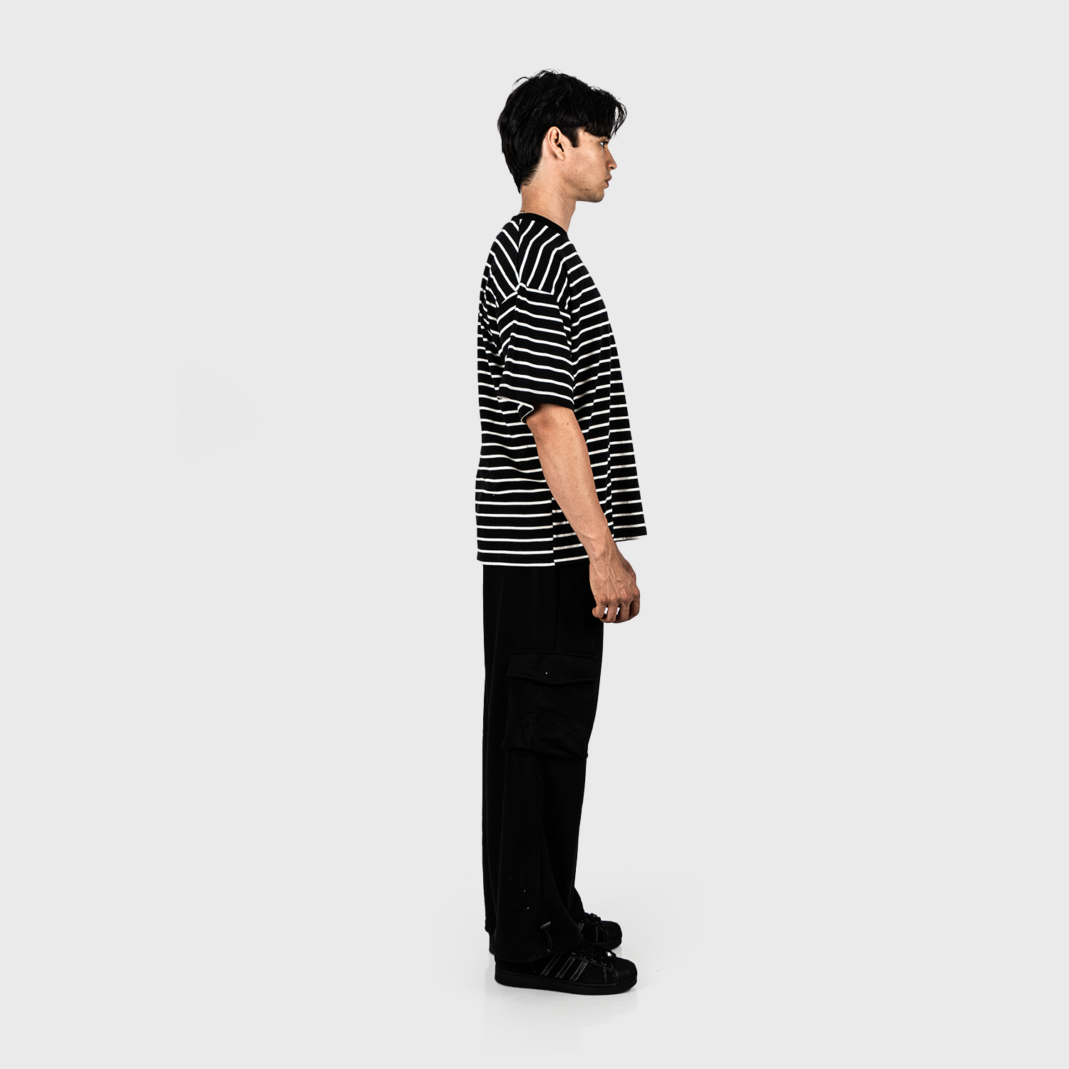 "Polo manga corta con rayas negras y blancas. Fit amplio y relajado, pensado para fluir cómodo en cualquier momento del día. Una prenda que no grita, pero se deja notar."